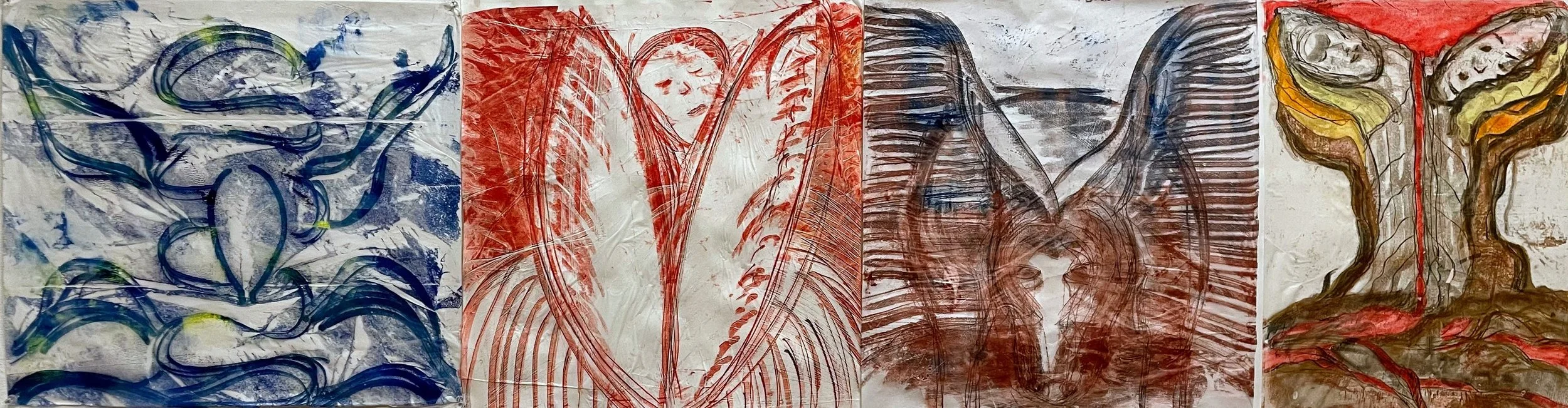 Touch Drawing is a simple process accessible to all, artist and non-artist alike. Participants are first guided through a brief meditation and visual imagery to help them settle into and access their felt sense. We begin by rolling wet paint out on a board and placing a piece of paper on top. We draw with our hands on the dry side of the paper and watch forms and images appear. There is no advanced planning about what to draw, no copying of images or attempting to draw something specific. Rather, the hands move in response to our internal sensations, feelings and impulses opening a channel to our creativity and bypassing our ego and critical thinking. We create several drawings in each session, as if documenting our moment to moment experience with lines, shapes and images. The process tends to bring about a state of calm and wonder as unexpected images begin to appear. Participants will be encouraged to engage in free or spontaneous writing to aid in the integration process. In later classes participants will learn how to mount their drawings, and have the option of going back into certain images with drawing materials should they choose to do so. Optional personal sharing in small groups will be encouraged as well. For more information visit the Touch Drawing Tab on this website